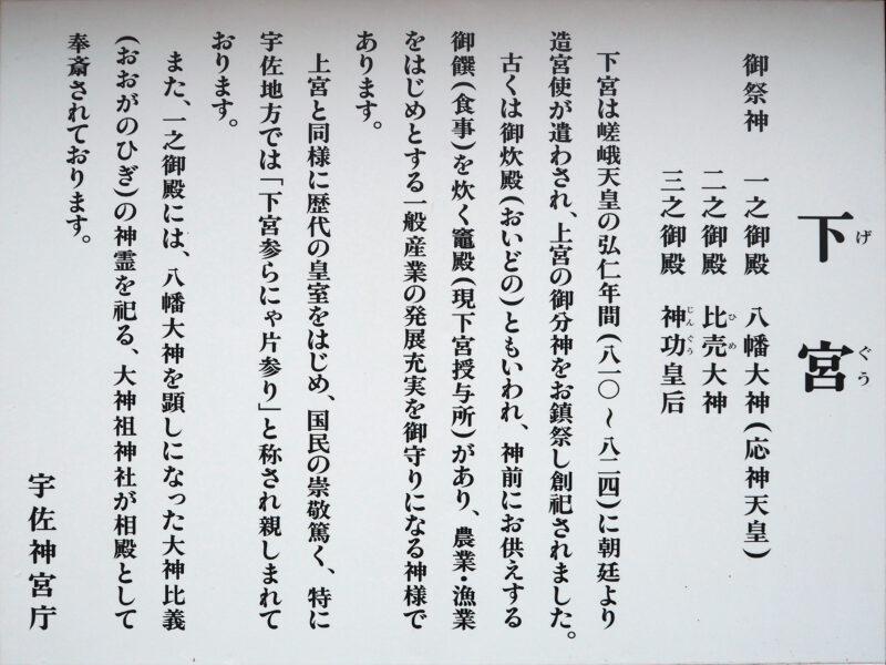 宇佐神宮の記録によると824年に八幡神からの神託で、八幡神の子女を祀るために神社を建てるべきであると告げられました。八幡神の願いを叶えるために若宮神社が852年に建てられました。