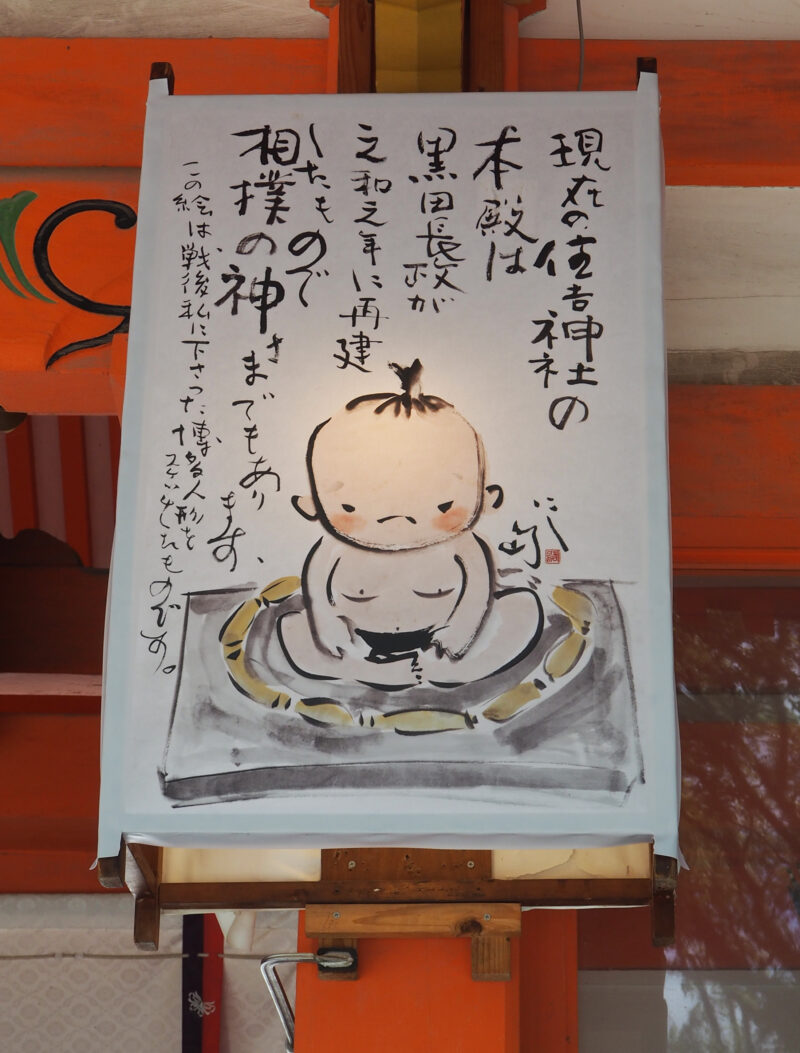 ・相撲会祭 十月十二日、十三日 神功皇后住吉大神の御神勅によりて三韓を征し給ひ、御凱旋の砌報賽祭執行の時大神の宣旨によりて兵士に力競べせしめられたるに始まれり。現今相撲司家吉田追風翁臨場、盛大なる式相撲を行ふ。