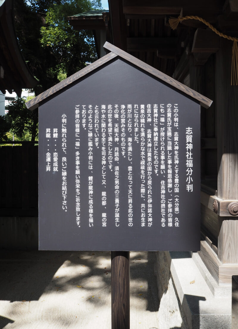 この小判は、志賀大神を氏神とする豊の国(大分県)久住の志賀氏が宝籤に当籤した事を報恩感謝し、ご参拝の皆様にも「福」が授けられる事を願い、住吉神社の摂社である志賀神社に奉納建立したものです。