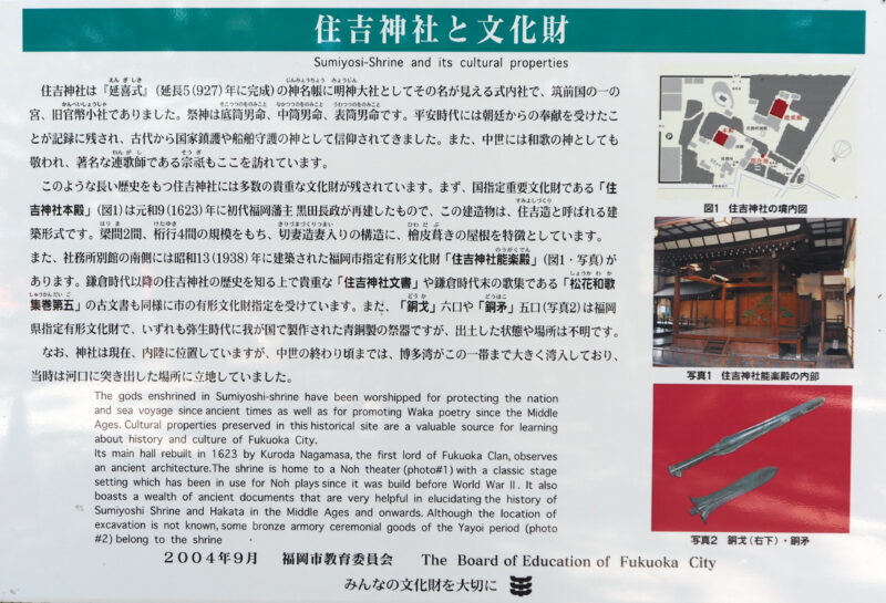 全国に約2000社ある住吉神社の始源とされ、開運除災・航海安全・船舶守護の神として信仰を集め、和歌の神としても崇め敬われてきました。現在の本殿は、元和9年(1623年)福岡藩初代藩主黒田長政が再建したもので、古来の神社建築様式を現代に伝える「住吉造り」として国の重要文化財に指定されています。また、当社が蔵する銅戈6口、銅矛5口は県の文化財に指定されています。 ー福岡市