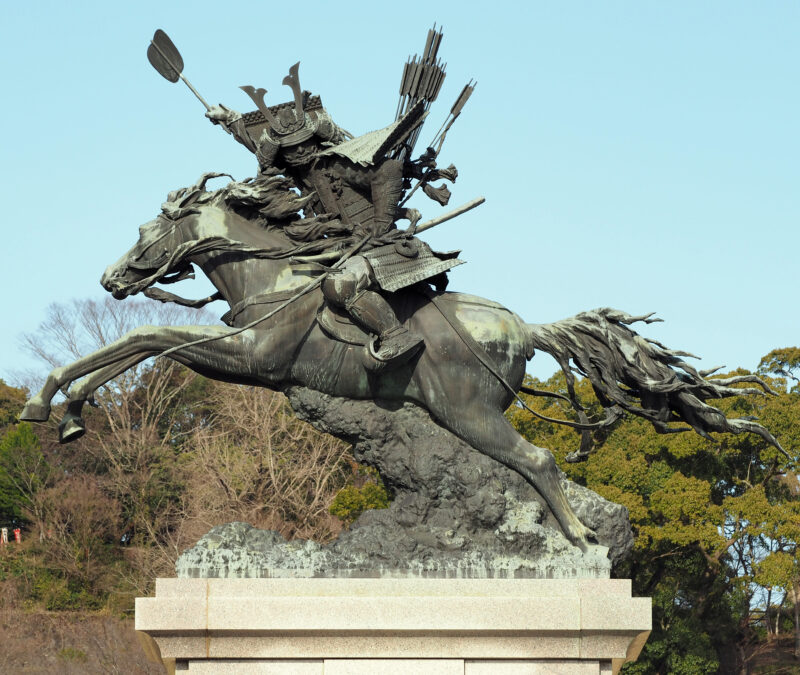日本三大合戦の一つといわれる筑後川の戦い(1359年)。出陣する菊池氏15代当主武光を表現したのが『菊池市民広場』に立つ騎馬像です。