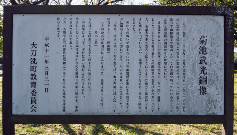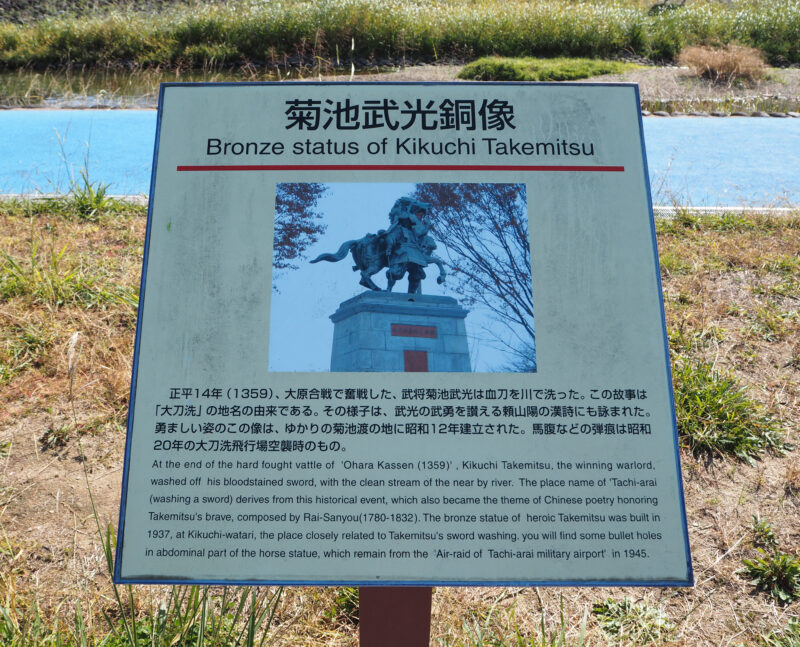 正平14年(1359)大原合戦で奮戦した、武将菊地武光は血刀を川で洗った。この故事は「大刀洗」の地名の由来である。その様子は、武光の武勇を讃える頼山陽の漢詩にも詠まれた。勇ましい姿のこの像は、ゆかりの菊池渡の地に昭和12年に建立された。馬腹などの弾痕は昭和20年の大刀洗飛行場空襲時のもの。