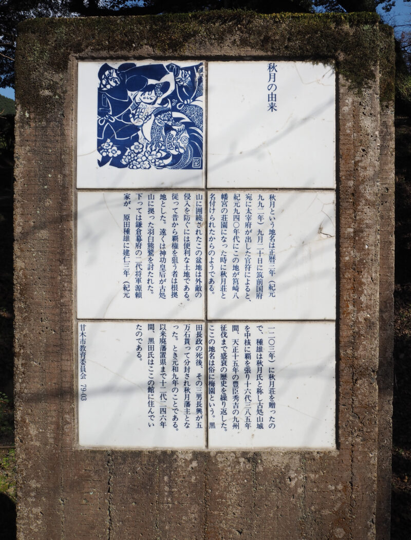 秋月という地名は正暦三年(紀元九九二年)九月二十日に筑前国府宛に太宰府が出した官符によると、九四〇年代にこの地が筥崎八幡宮の荘園になった時に秋月荘と名付けられたからのようである。 山に囲鐃されたこの盆地は外敵の侵入を防ぐには便利な土地である。従って昔から覇権を狙う者は根拠地とした。 遠くは神功皇后が古処山に拠った羽白熊鷺を討たれた。 下っては鎌倉幕府の二代将軍源頼家が、原田種雄に建仁三年(紀元一二〇三年)に秋月荘を送ったので、種雄は秋月氏と称し古処山城を中核に覇を張り十六代三八五年間、天正十五年の豊臣秀吉の九州征伐まで盛衰の歴史を繰り返した。ここの地名は俗に梅園という。 黒田長政の死後、その三男長興が五万石貰って分封されて秋月藩主となった。とき元和九年のことである。 以来廃藩置県まで十二代二四六年間、黒田氏はここの館に住んでいたのである。