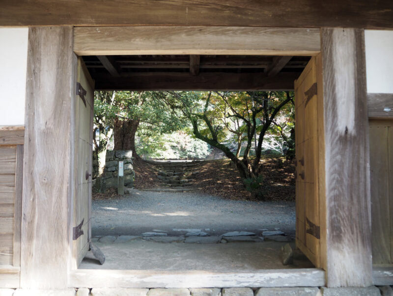 この門は、秋月藩主黒田家の居城である秋月城の裏手門として使用されていたものです。老朽化に伴い昭和62年から3年間、保存修復工事及び発掘調査が実施されました。その結果、北棟のさらに北側に古い礎石が発見され、原形に近い形(北六間、南七間)での復元がなされました。
